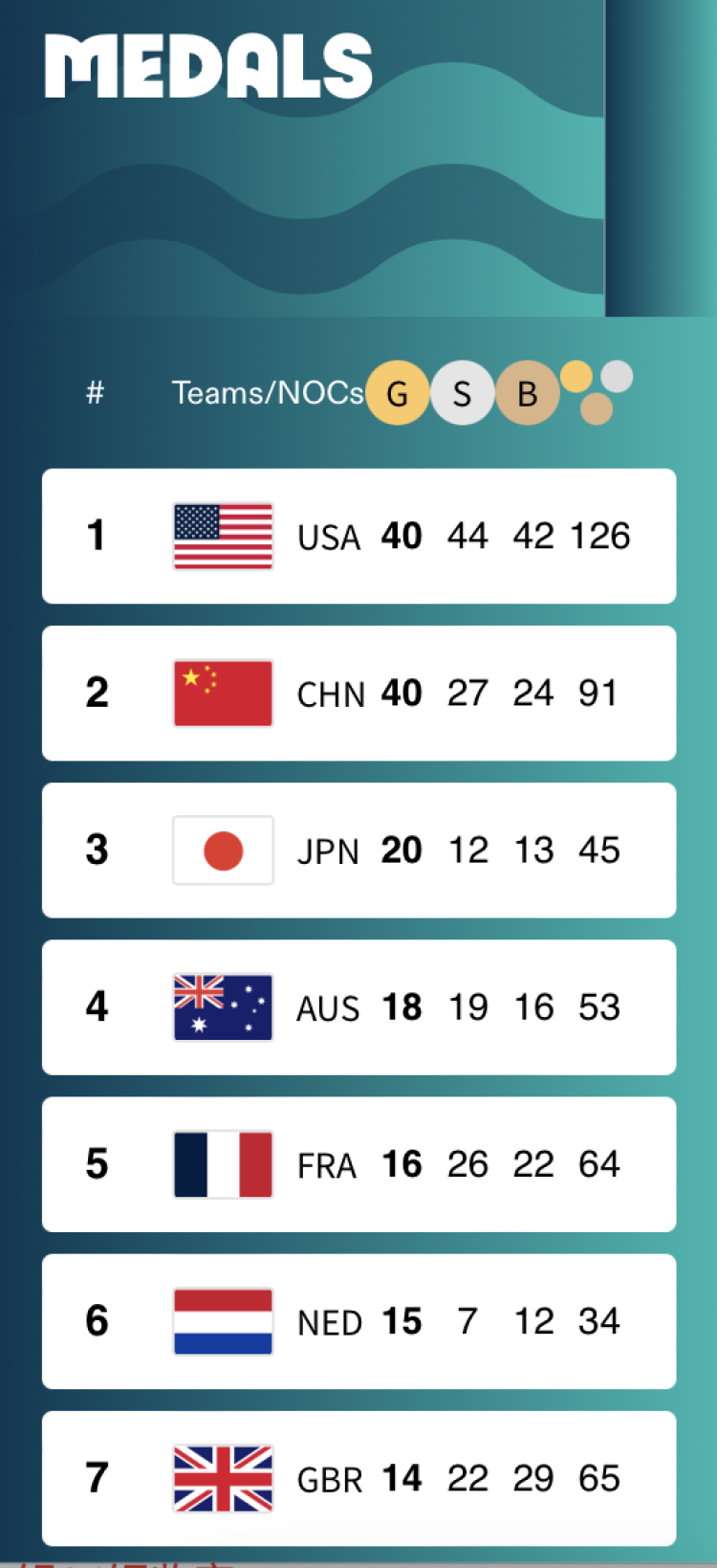 金牌榜上,中国与美国并列世界第一位,位于第三到第五位的分别是日本、澳大利亚、法国。