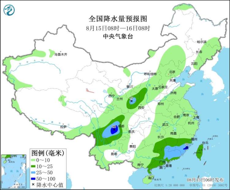 图2 全国降水量预报图(8月13日08时-14日08时)