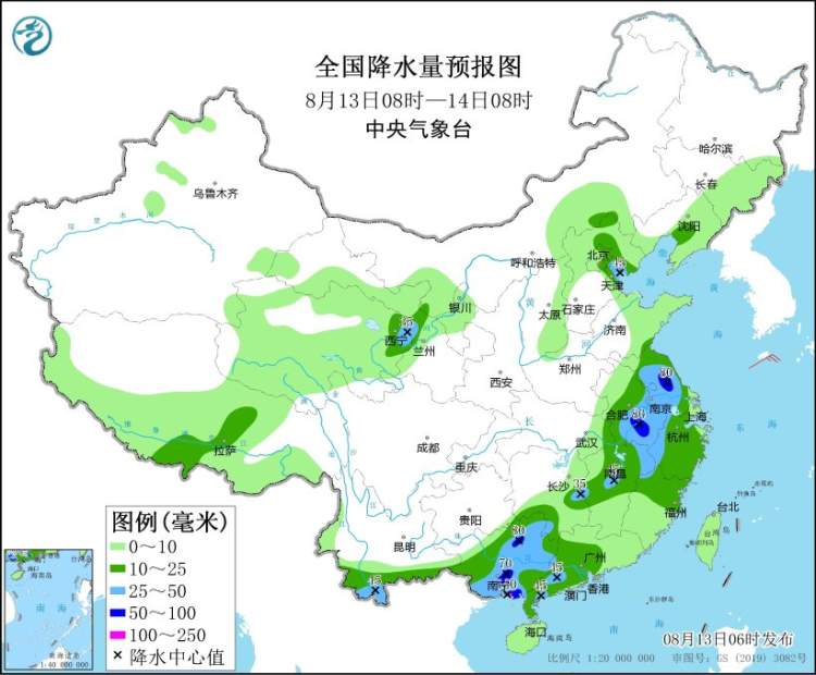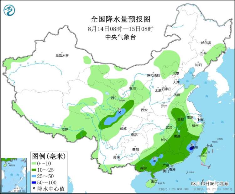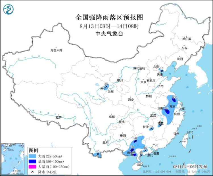 预计,8月13日08时至14日08时,江苏中南部、安徽南部、浙江西部、江西东北部和中部、湖南东部和西南部、广西中东部、广东西南部以及河北东部、云南南部、青海东部等地的部分地区有大到暴雨,局地大暴雨(100~120毫米)(见图1),上述部分地区伴有短时强降水(最大小时降雨量20~50毫米,局地可超过80毫米),局地有雷暴大风等强对流天气。中央气象台8月13日06时继续发布暴雨蓝色预警。