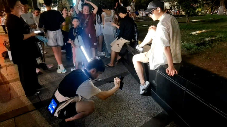 因为需求旺盛,这里已经形成了初具规模的拍照市场。手持着灯具、专业设备的摄影师们,在人群中不断穿梭,推销着自己的生意。