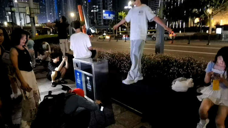 8月4日晚,记者在金茂大厦附近区域看到,大量专程赶来打卡网红“机位”的游客,聚集在金茂大厦附近的上街沿上。为了能够拍出想要的效果,他们或坐或躺在地上,或站在垃圾桶、花坛上,姿势千奇百怪。