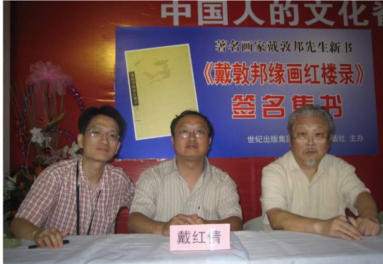 2006年,杨柏伟(左1)与戴敦邦(右1)、戴红倩在《戴敦邦缘画红楼录》签售会上(资料图片)