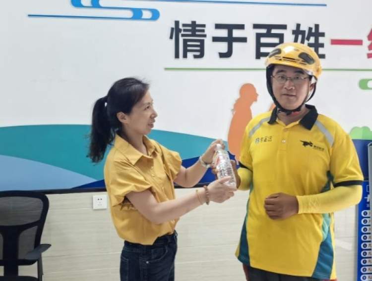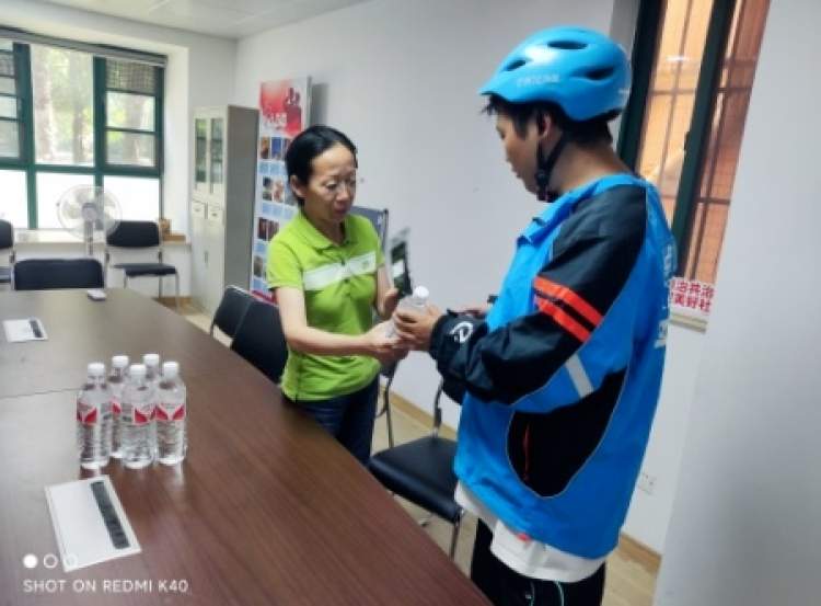富平居民区党群服务站对进入社区服务居民的快递小哥、外卖员、环卫工人等城市建设者夏季送清凉,利用站点的一瓶矿泉水开启了慰问模式。
