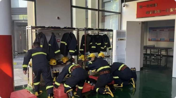 训练现场,消防队员们正在进行1分钟出警实战演练。随着警铃响起,消防战士们迅速集结,准确无误地穿戴个人防护设备,车辆集结与出动井然有序。