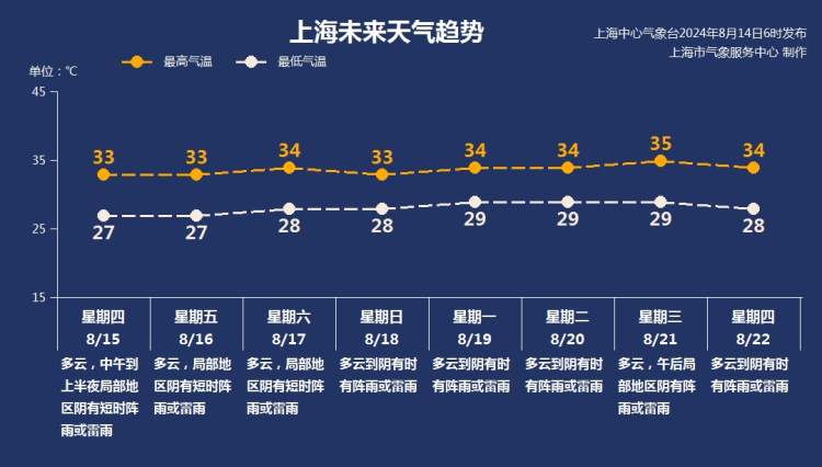 本周上海主要处在副热带高压边缘,受海上偏东气流影响,天空云系较多,有散装的阵雨或雷雨袭扰。这种降水随机性强,时间短,对出行影响不大,但会给大家洗晒带来困扰。气温总体在27~35℃之间,虽然不一定能达到高温线,但因为湿度较大,体感显得闷热不舒适。