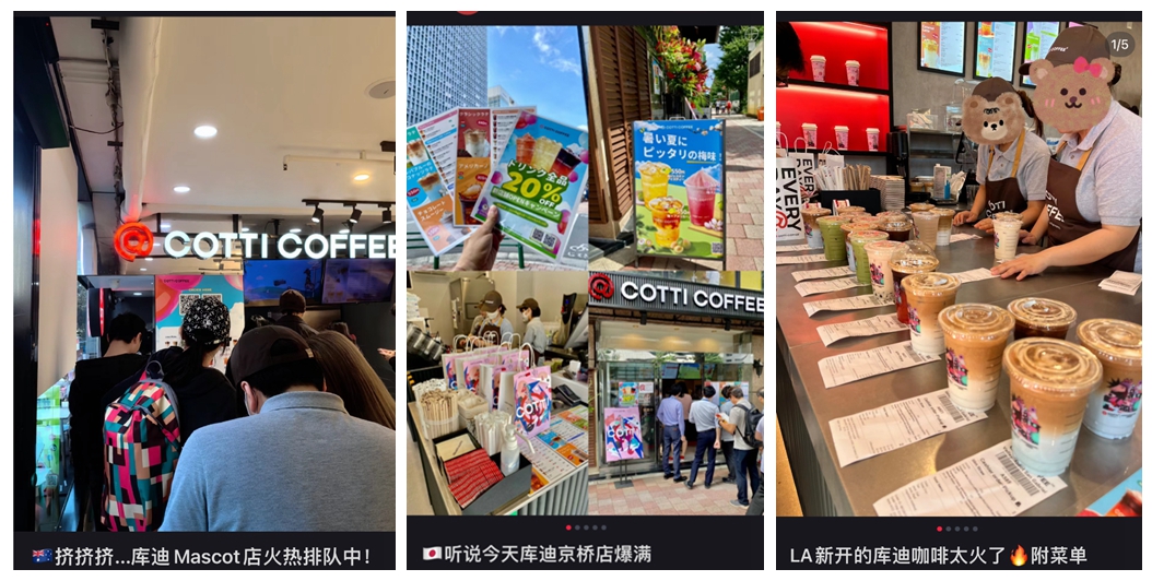 (网友在社交平台分享的库迪咖啡悉尼、东京、洛杉矶门店排队情况 )
