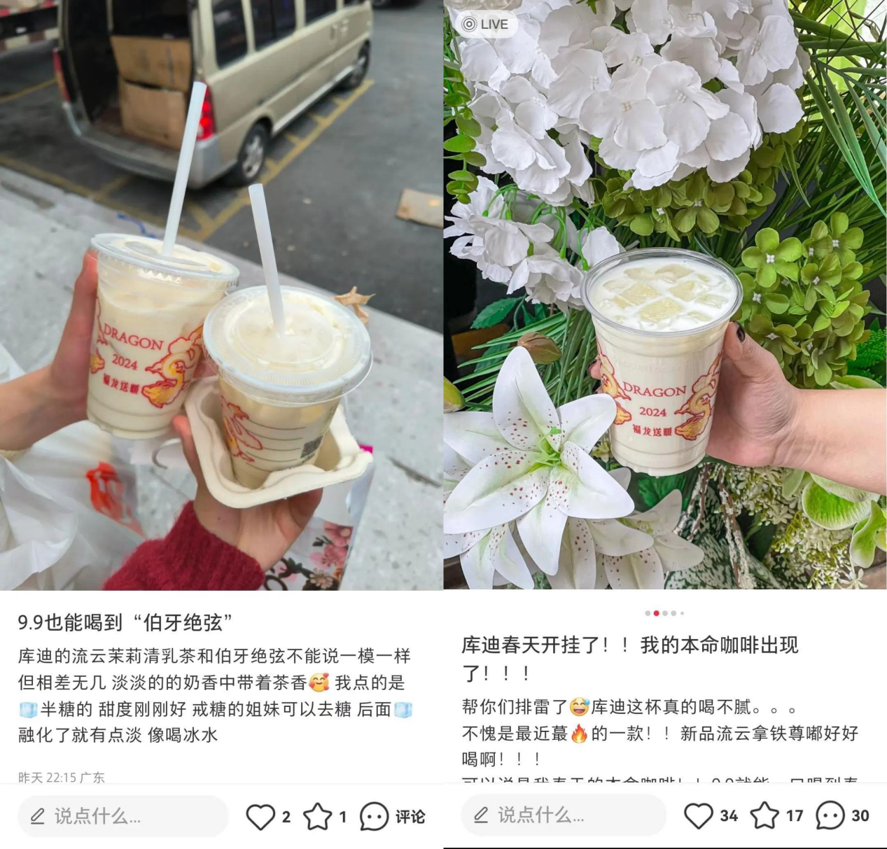 对于消费者来说,全场9.9元的库迪已然是咖啡界的一股暖流,超高的品质,合理的价格,简直是性价比之王。而库迪也确实走在“行业先锋”的路上。早在3月,库迪推出的“流云茉莉轻乳茶”就俘获了一大波奶茶爱好者,有人说“跟伯牙绝弦不能说一模一样,但相差无几”。接着库迪又在4月开启“茶饮季”营销活动,一口气上新六大类二十余款茶饮产品,咖啡coffee和奶茶tea,早C晚T承包消费者全天的饮品。