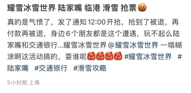 8月20日上午,耀雪冰雪世界发布一则推文,推出专属福利票,210元畅滑4小时,仅限8月23日、8月30日、9月1日三天使用,20日中午12点开抢。原价410元起的4小时滑雪票,210元相当于半价了,不少滑雪爱好者定好闹钟跃跃欲试准备开抢,没想到却遇到了小程序被挤崩、抢到了内测票却被官方退票、或者已扣款却看不到订单信息等种种bug。