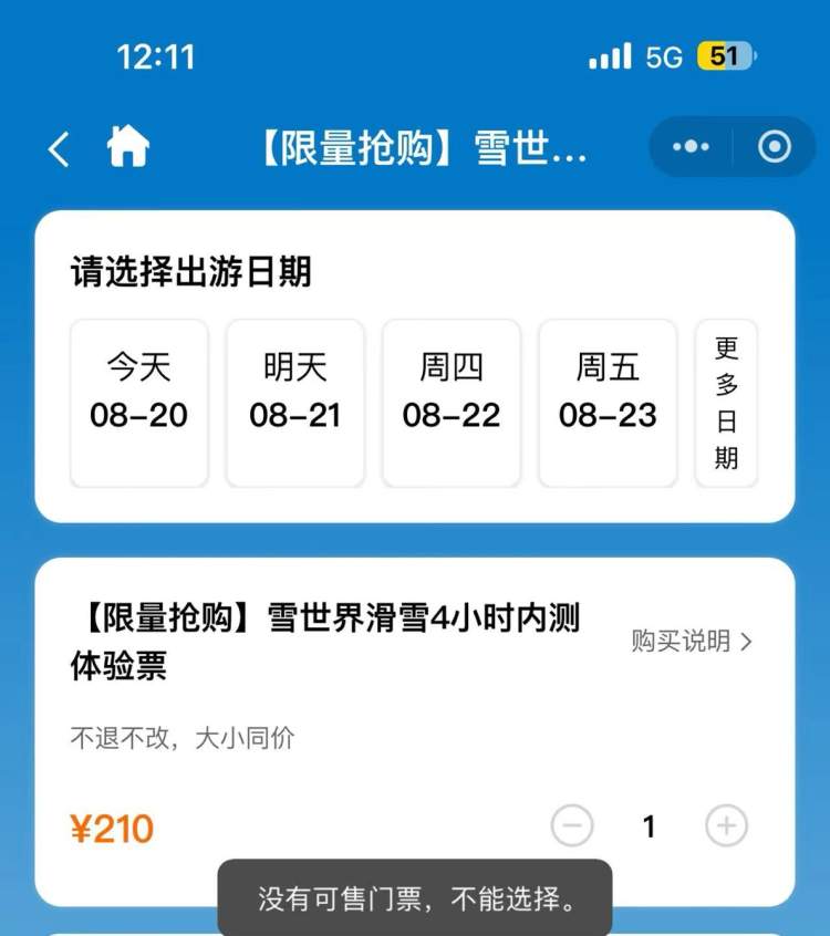 一直等到12:09,小程序已经恢复正常,210元的内测体验票依然挂着,但点进去,没有“可游玩的日期”可以选择,系统也提示“没有可售门票,不能选择”,购票失败。