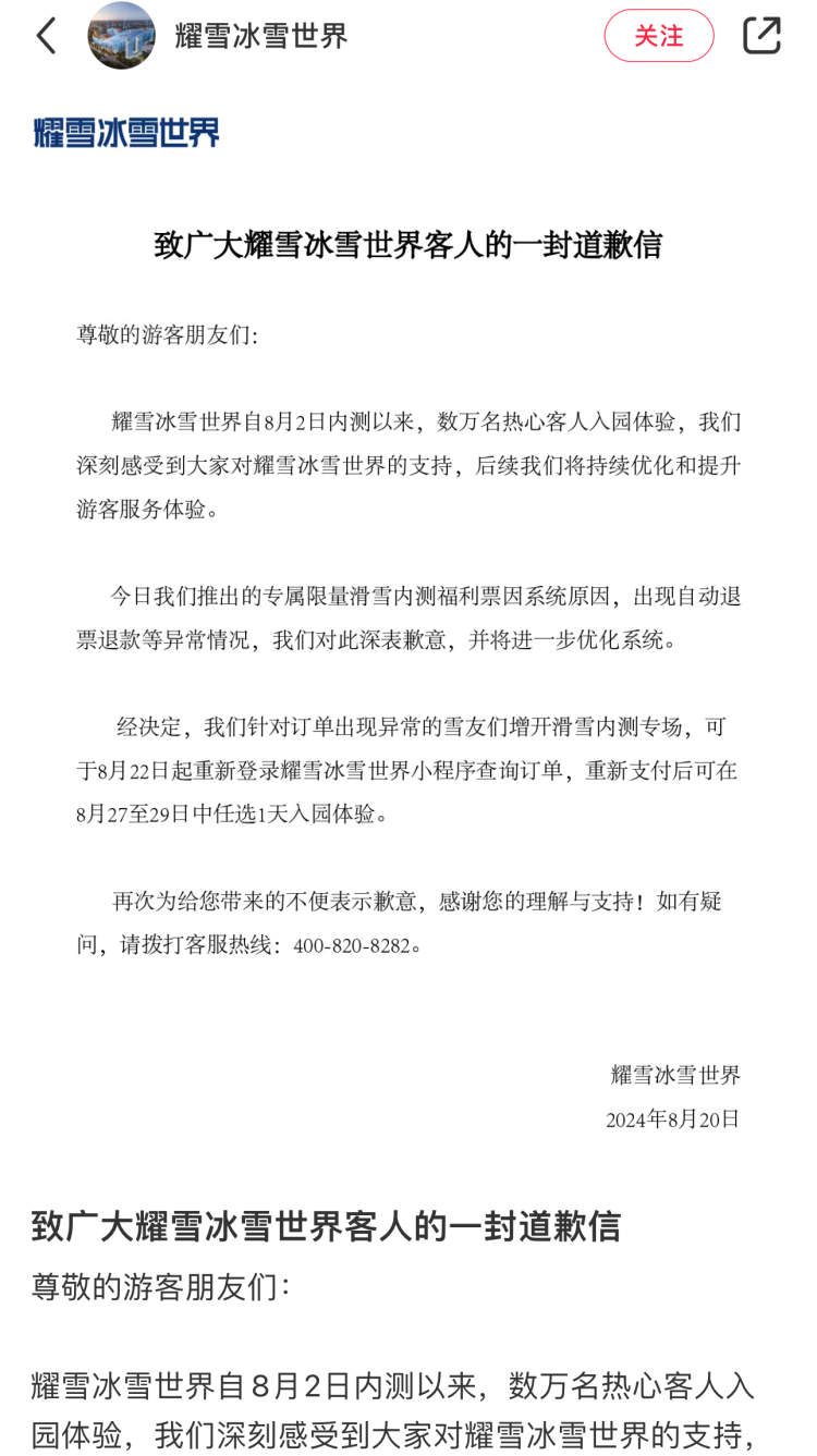 致歉信中表示:“对于针对订单出现异常的雪友们,增开滑雪内测专场,可于8月22日起重新登录耀雪冰雪世界小程序查询订单,重新支付后可在8月27至29日中任选1天入园体验。”