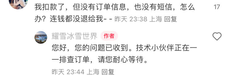 此外,对于已支付但未查询到订单的情况,耀雪表示正在技术排查。