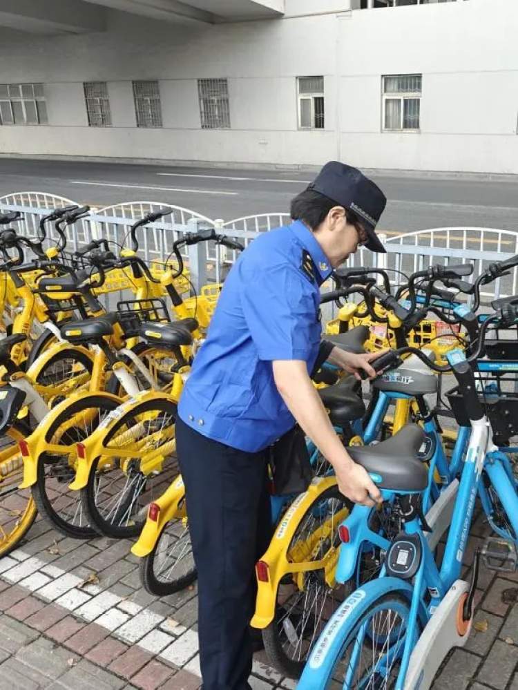 城管执法人员检查共享单车停放