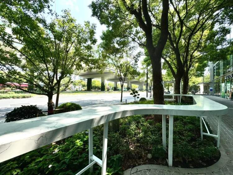 不仅如此,在功能植入方面,设计师改变绿地单一职能,通过植入休憩场地、坐凳、休憩亭、吧台座椅、办公亭等设施,为设计中心工作人员提供户外活动与交流场所,发挥了20分钟公园效应,提升其绿地开放功能。并且在保留现状乔木基础上,植入无尽夏八仙花、百子莲、火焰南天竹等花叶植物,提升绿地的整体绿化效果。