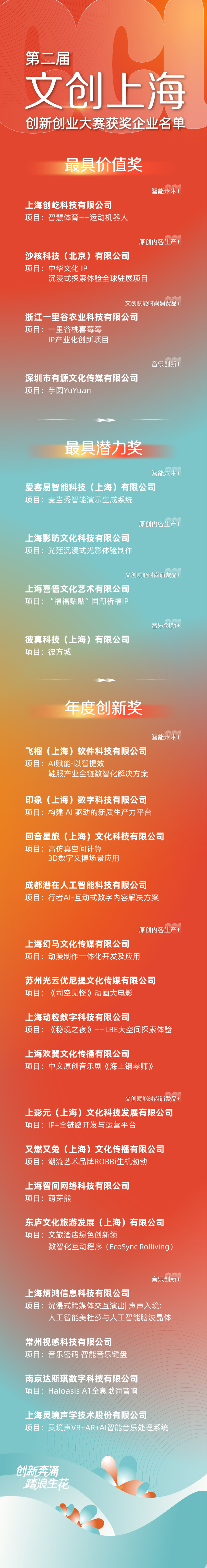 2024年8月23日,第二届“文创上海”创新创业大赛(以下简称“大赛”)颁奖典礼在上海电影广场海上五号厅隆重举行。本届赛事由市委宣传部、市经信委、市科委、市人社局共同指导,市文创办主办,市文促会、德必集团、华为云、海通创意联合承办,上海银行战略合作。