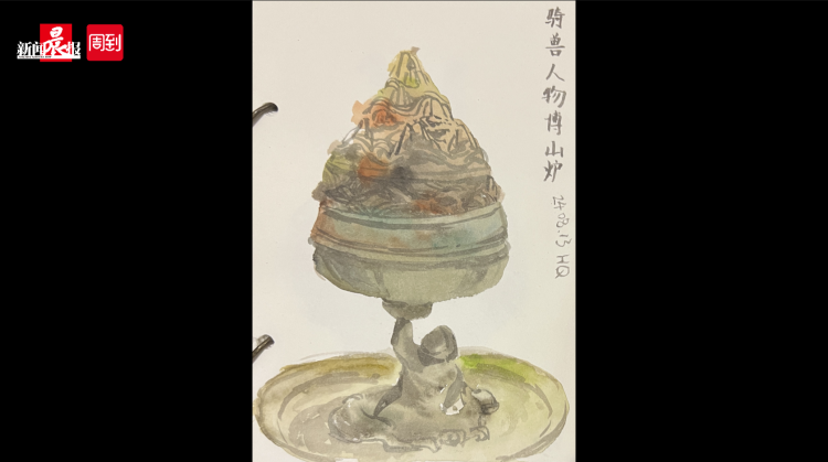 正在读初中的贺钦喜欢用水彩画的方式在博物馆记录文物,就在一周前的8月13日,她随秦老师在闵行博物馆写生时看到了骑兽人物博山炉,并绘画下来,没想到以《西游记》为蓝本的游戏《黑神话:悟空》中,恰好出现了同款文物。