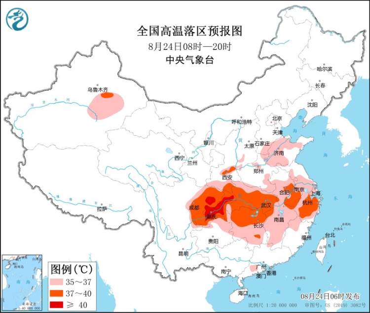 预计8月24日白天,四川盆地、重庆、湖北、湖南、安徽中南部、江苏中南部、上海大部、浙江、江西、福建西北部、贵州北部、云南东北部以及新疆南疆盆地东部、陕西中南部、山西南部、河北南部、山东北部和西部、河南北部和南部等地有35℃以上高温天气,其中,四川盆地东部、重庆、陕西南部、湖北大部、湖南北部、安徽南部、浙江中部以及新疆吐鲁番盆地等地部分地区最高气温37~39℃,局地可达40℃以上。