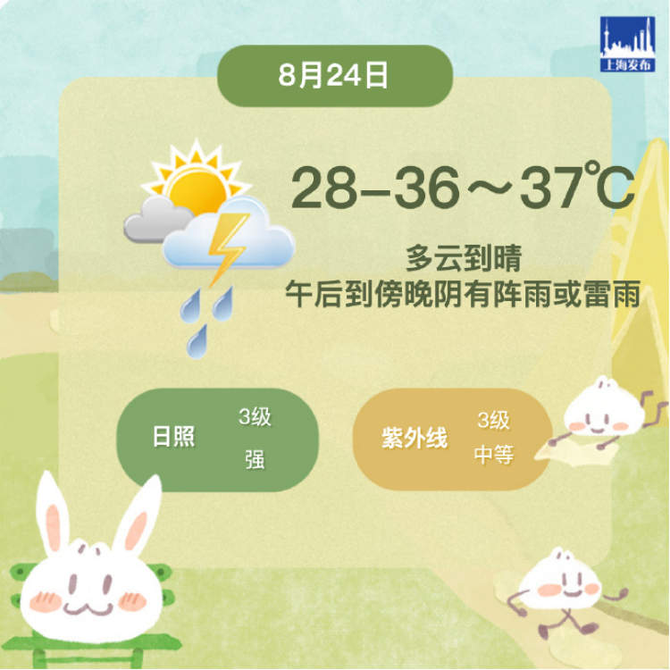 申城天气:今天多云到晴为主,气温28℃-36~37℃,午后到傍晚局地阴有阵雨或雷雨 周到君 2024-8-24 来源:周到上海 今天上海多云到晴,午后到傍晚局地阴有阵雨或雷雨,偏东风3-4级,沿江沿海地区4-5级,雷雨时阵风7-9级,风向偏北,气温28℃-36~37℃。 明天上海多云为主,外出游玩的朋友要注意防范局部雷阵雨。 下周初和周中,上海最高气温止步33℃-34℃。下周末,副热带高压再次加强,上海高温天或又将出现。 (内容综合自上海发布、上海市天气) 来源:周到上海 作者:周到君 赞一个 (0)