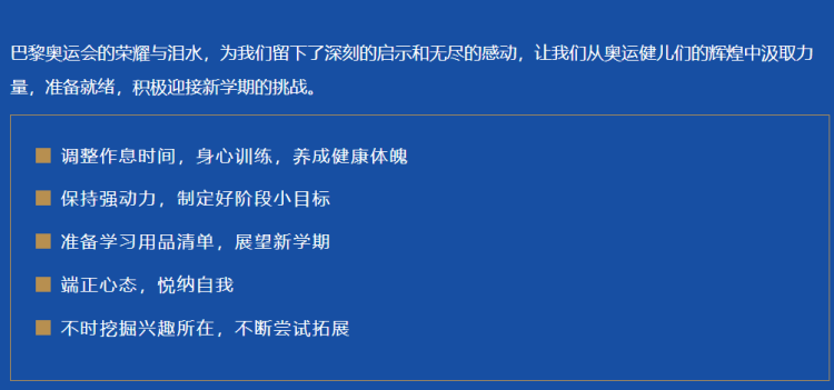 暑期进入尾声,同学们应当主动自查各种活动完成情况,逐步增加自主学习和阅读时间,调整状态。