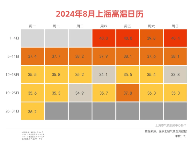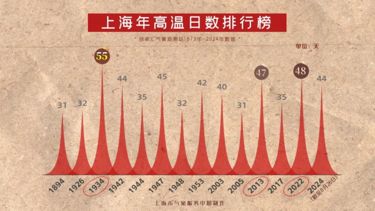 今年的高温日数量,已经逼平1942年,达到徐家汇站高温日历史排名第五高位。