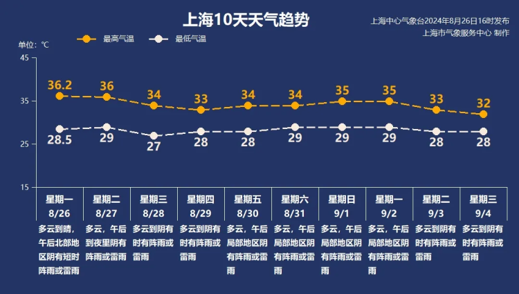 天气预报显示,明天上海最高温度继续可达36℃,但是大到暴雨马上要来了。