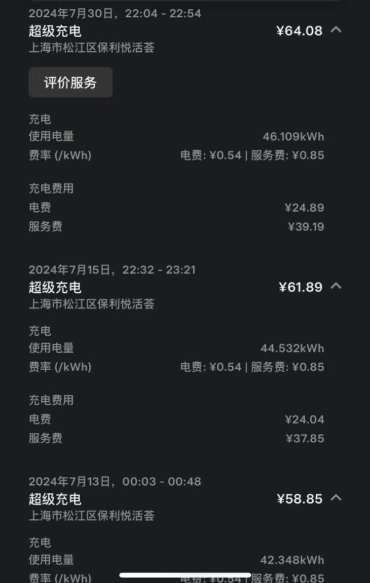 这个超级充电站在22点后的充电价格为每度电1.39元,其中包含0.85元的服务费,通常彭女士大概充电50分钟左右,花费50元至60多元不等。