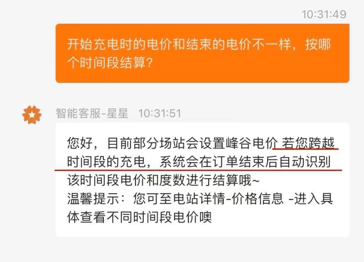 ▲“特来电”客服回复跨时段充电会分开计费
