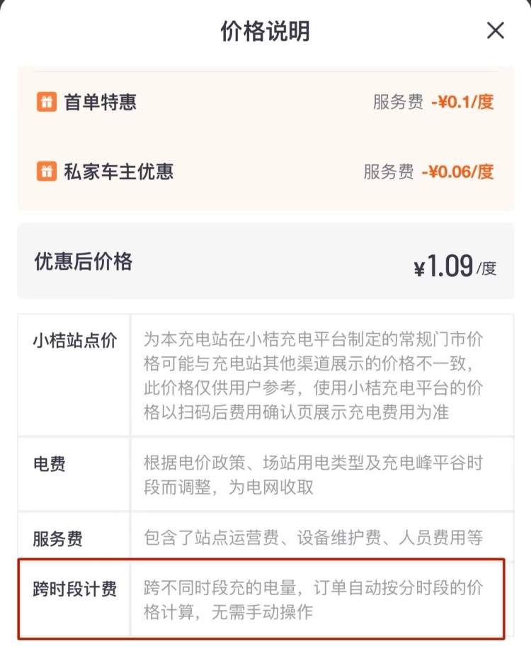 ▲“小桔充电”在价格说明中写明了“跨时段计费”细则