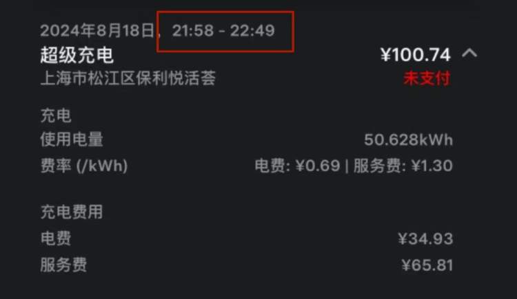 8月18日晚上,彭女士照旧来到保利悦活荟,给特斯拉电车充了50分钟的电,可是充完一看,才发现电费总价为100.74元。根据“Tesla”App显示,彭女士在当天21点58分开始充电,22点49分结束,电费单价为每度电1.99元,包含1.3元的服务费。