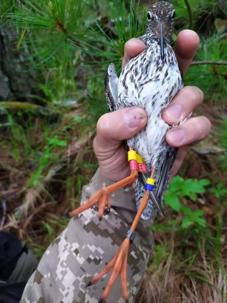 近期,崇明东滩保护区则目击了一只在俄罗斯远东地区环志的红脚鹬,环志日期为2020年7月9日,编码为“EN”。
