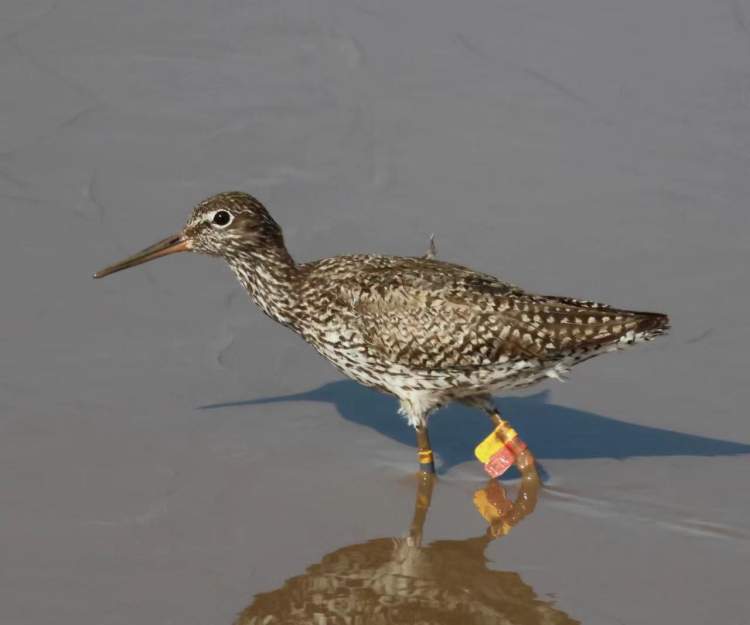 近期在崇明东滩观察到的一只在俄罗斯环志的红脚鹬