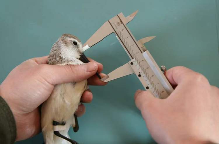 崇明东滩保护区工作人员给鸟类环志时测量喙长,脚上佩戴上黑下白的旗标