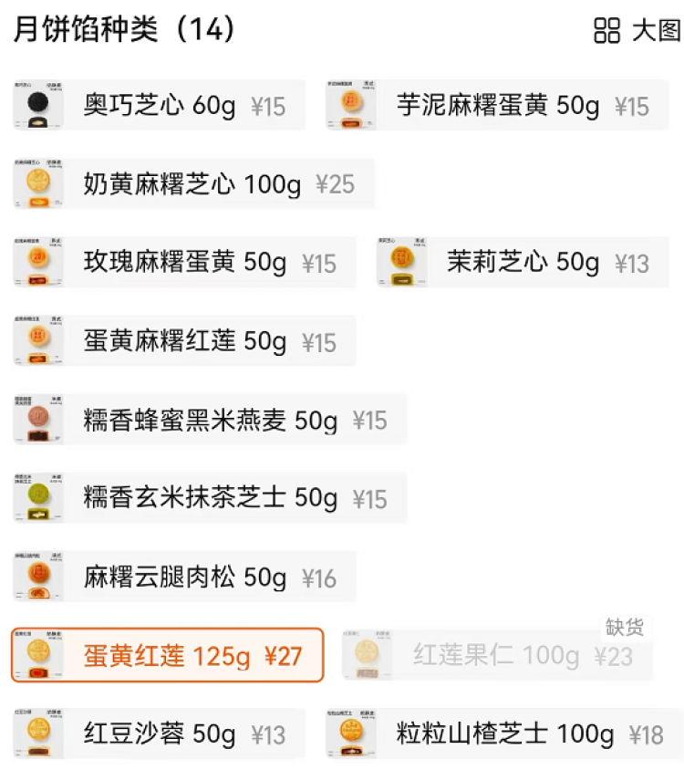 记者查询好利来官方旗舰店发现,其散装月饼的价格从13元到27元不等。从价目表上看,27元的蛋黄红莲口味价格最贵,但如果细究重量会发现,蛋黄红莲单只125克,好歹个头比较大;而玫瑰麻薯蛋黄、糯香蜂蜜黑米燕麦、麻薯云腿肉松等口味,小小的一只,50克就要15元了。