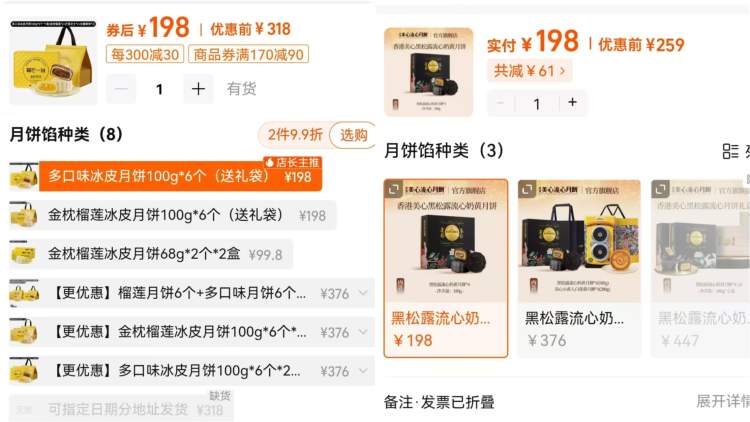 比如,主打榴莲口味的榴莲一刻冰皮月饼礼盒,6只装卖198元,平均每只价格达到33元;星巴克星情月饼礼盒,6只装267元,平均每只44.5元;香港美心黑松露流心奶黄月饼,4只装卖198元,平均每只价格近50元……