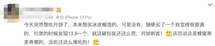 比如,网友“小周”花13.9元买了一个冰皮月饼,认为罪名有三:破包装、贵、难吃。