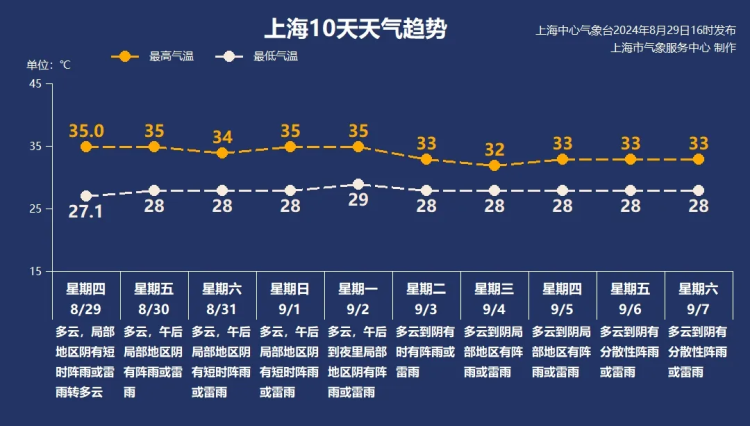 一直到下周一,上海的日最高气温都在35℃高温线附近,最低气温也有28-29℃。