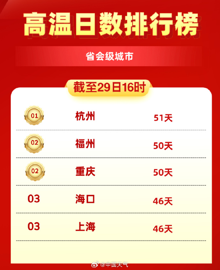 来自中国天气网的统计显示,在截至今天16时的省会级城市高温日数排行榜上,隔壁杭州以51天位列第一,福州、重庆暂列第二,海口、上海第三。
