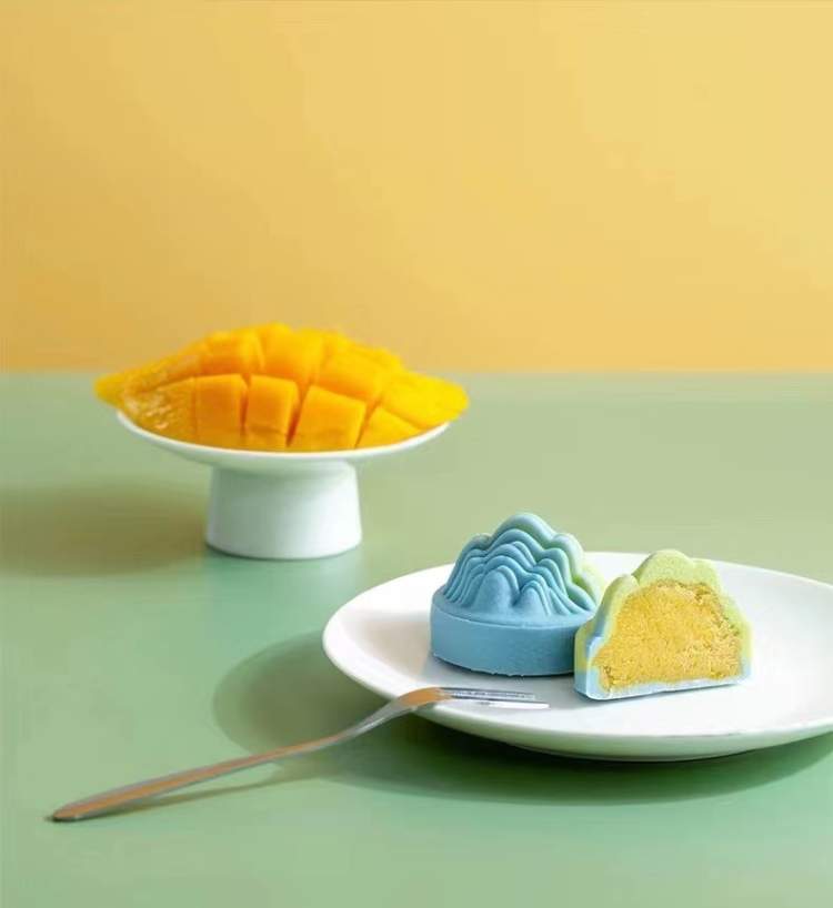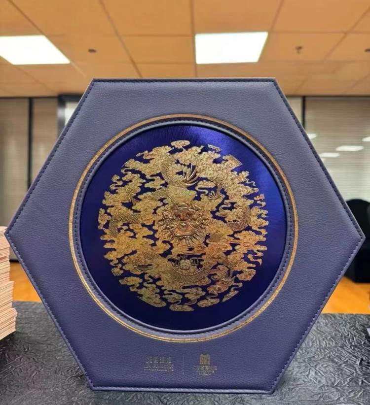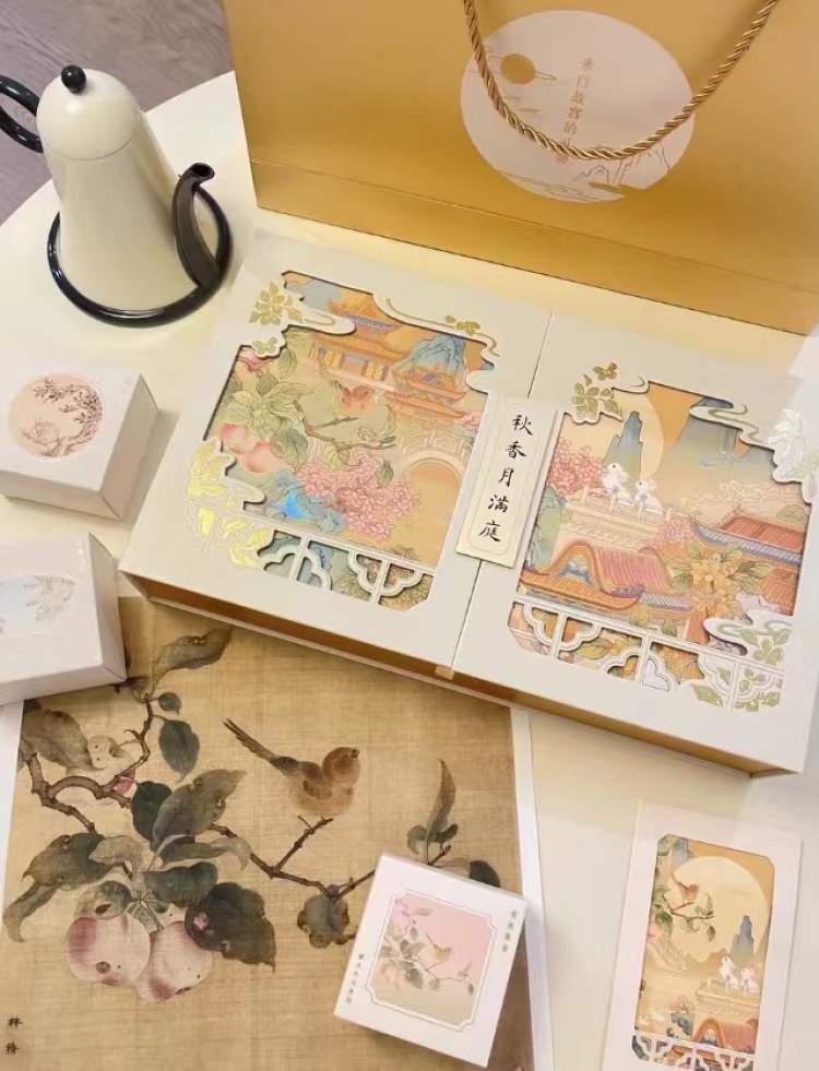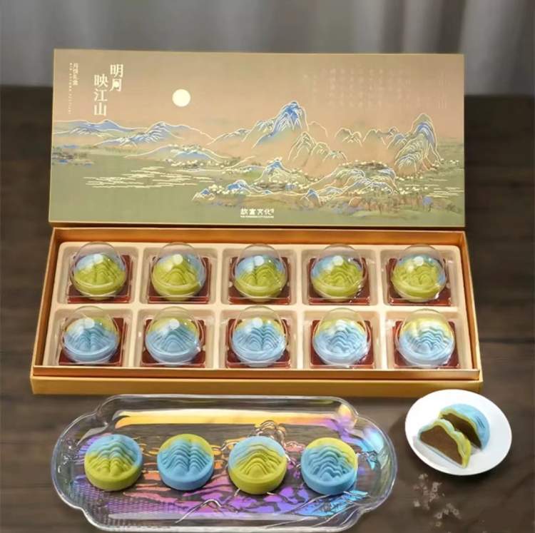 另一款“明月映江山”中秋礼盒,设计灵感来源于北京故宫馆藏北宋王希孟的名作《千里江山图》,将原作中的山峦起伏转化为江山型月饼以及炫彩玻璃盘,开启了视觉味觉共享的赏画体验。