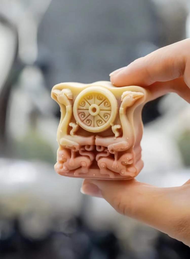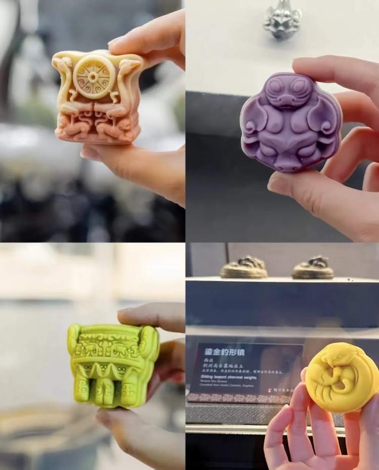 荆州博物馆虽然是小馆,但此次联合蜜糖公主推出的文创月饼却大有黑马之势。每款月饼的造型都是馆藏重要文物的样式,月饼拿上手,仿佛将厚重的楚文化捧在了手上。几款月饼分别选取了馆内战国虎座鸟架鼓、楚国用鼎、战国银带钩、西汉鎏金豹形镇的造型,颜值实在是太高了。