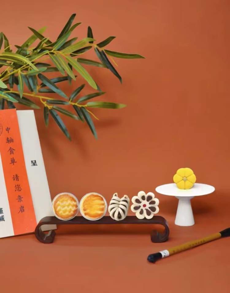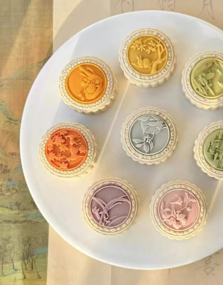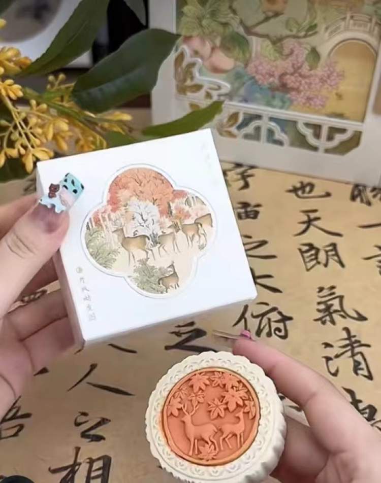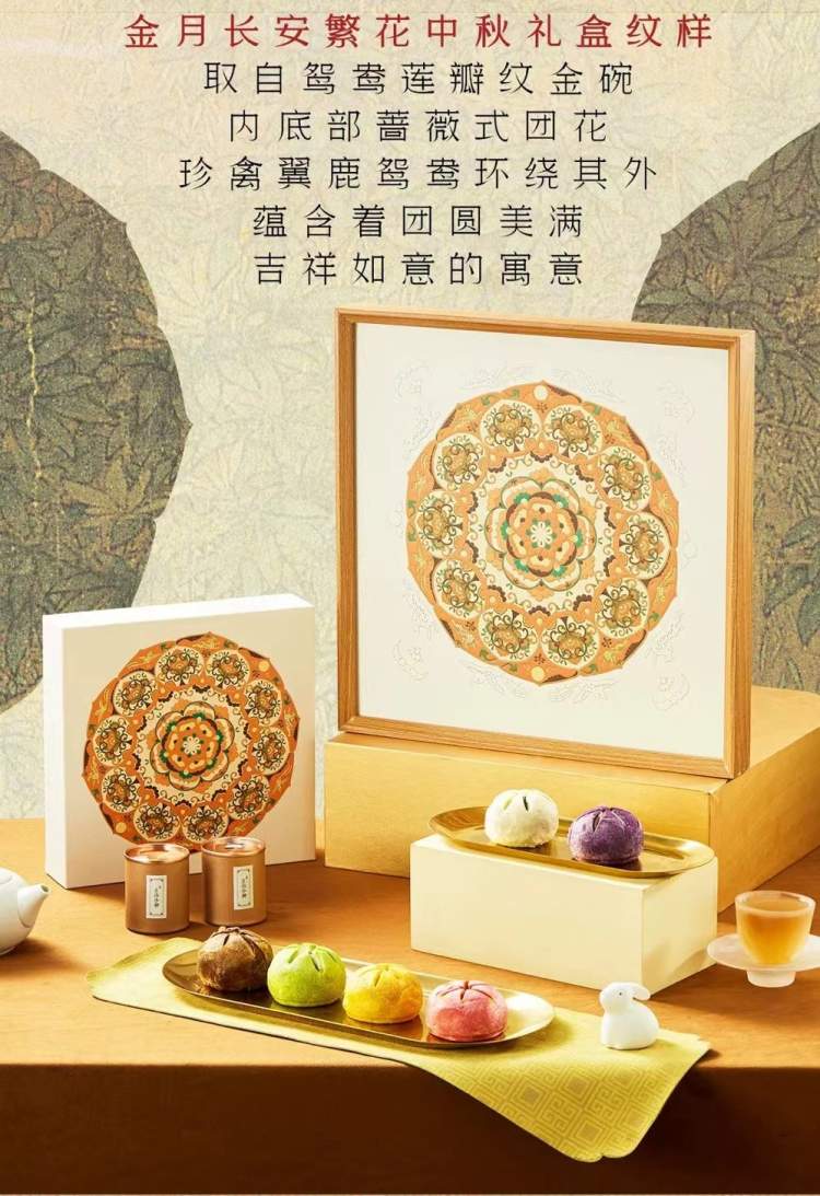 一款是“秋香月满庭”,冰皮月饼做成了银首饰盒的样子,图案来源于故宫的文物古画,如清乾隆蒋溥的《月中桂兔图》、清马逸的《菊酒蟹螯图》等。