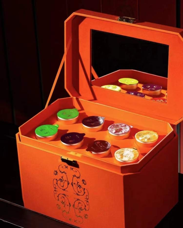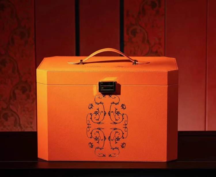 湖南博物馆与长沙君悦酒店联名推出的“尊月”中秋礼盒,橙色方盒呈现出浮光跃金的质感,打开后是一个化妆包样式,外盒的纹样设计灵感来源于西汉“君幸酒”云纹漆耳杯。这款礼盒将古风国潮嫁接了尊贵奢华之意,设计很给力。