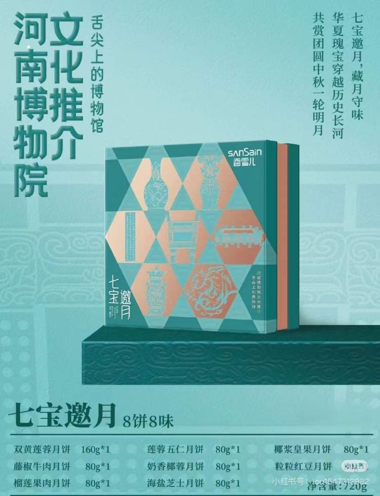 以善于出圈而闻名的河南博物院今年联合香雪儿推出了联名月饼“月光宝盒”。外盒灵感来自于馆藏国宝妇好鹄尊,呈青铜色,外形犹如一个月光宝盒。河南博物院还推出一款“七宝邀月”礼盒,其中的七款月饼都是以馆藏七件镇馆之宝为原型进行设计,让千年文化与中秋祝福精彩相遇。