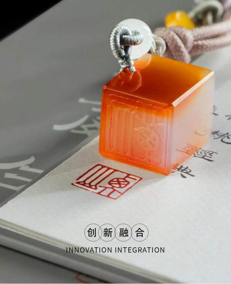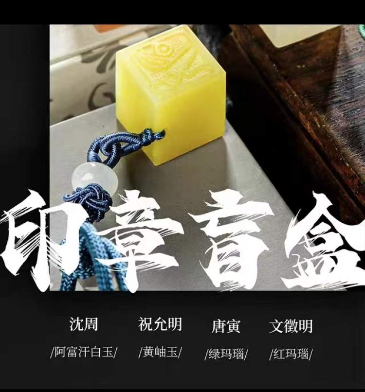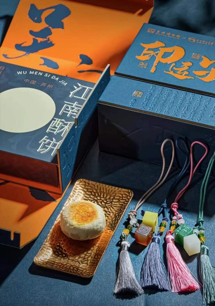 苏州博物馆今年还与书香酒店联名推出一款带有印章盲盒的中秋礼盒“印运尔生”。里面除了江南酥饼,还有一个印章盲盒,共有四款印章,印章上一面刻着吴门四大家沈周、祝允明、唐寅、文徵明的名号,一面刻着当下人们的心态,如“奋斗”“躺平”“不羁”“微醺”。礼盒中藏印章,这也算是今年博物馆文创月饼中的一大创举了。