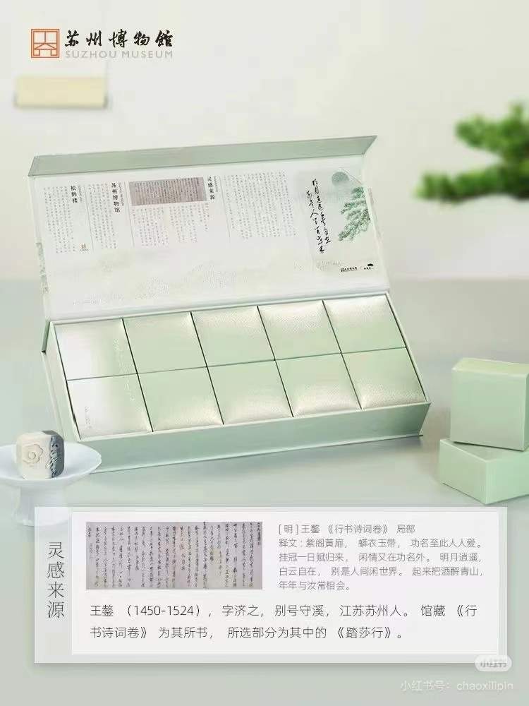 苏州博物馆今年的联名月饼请出明代大学士王鏊助阵,“明月逍遥”中秋礼盒选取了馆藏王鏊《行书诗词卷》中“明月逍遥,白云自在”的诗句,将书法意境与无垠的心境融入设计中。月饼外盒青绿烫银,化作静谧湖水倒影远山,好一派逍遥自在的中式美学。月饼上的王鏊书法,更为中秋呈上清雅之气。