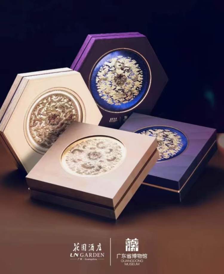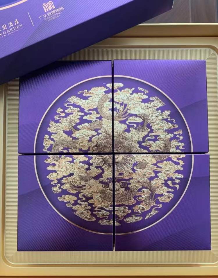 广东省博物馆与广州花园酒店的联名月饼向来高调,今年的月饼礼盒呈现经典的金色调和了精美的龙形图案设计,设计元素运用了广东省博物馆馆藏的“清乾隆广珐琅铜胎云龙八宝盆”的图案,穿行于彩云间的金龙很有质感,也寓意了生活四时顺意,富贵吉祥。