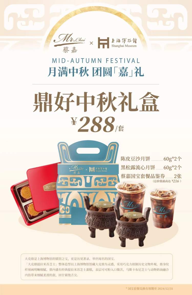 一款是上海博物馆与蔡嘉联名的“鼎好”中秋礼盒。礼盒选取了上博镇馆之宝大克鼎为元素进行设计,里面除了大克鼎纹样的月饼之外,还有两张蔡嘉国宝套餐品鉴券,可以品尝到上博与蔡嘉联名推出的网红产品——大克鼎形状的提拉米苏芝士。