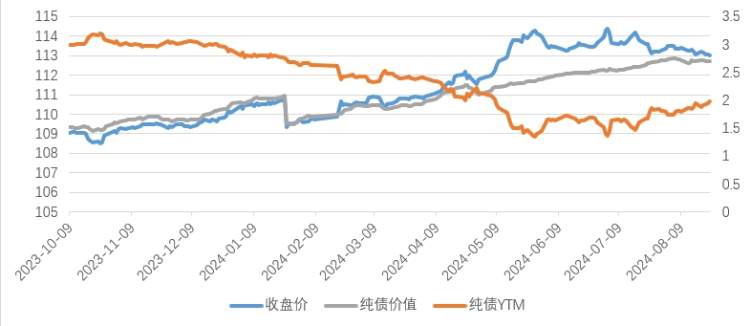 图5:C转债收盘价格与纯债价值、YTM对比