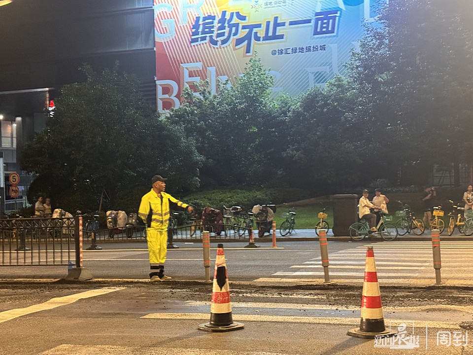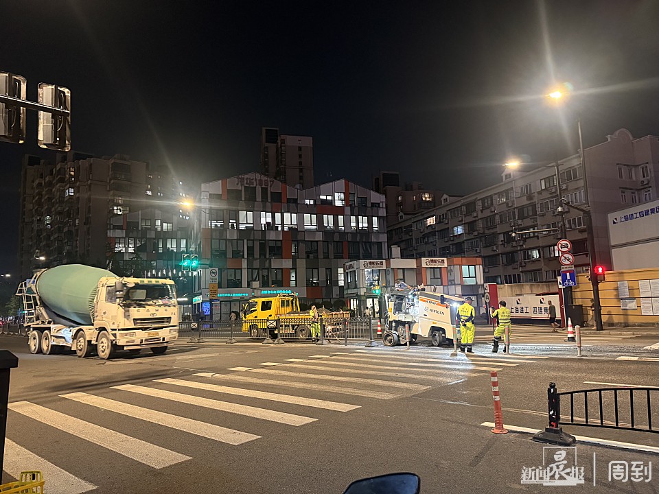 “过马路小心点,我们这边正在进行路面修复。”8月26日晚上8点半左右,龙华中路与龙华路交叉口处的斑马线上,一群身着制服的工作人员正在对压坏的路面进行修复。有行人和非机动车路过时,裴师傅都会提醒一句。