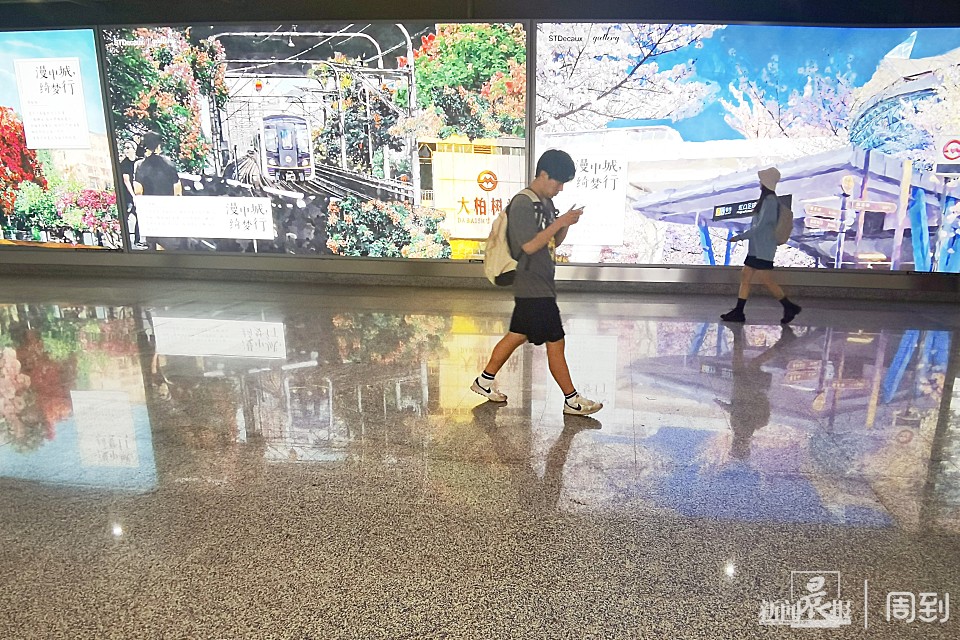 此外,通道两侧和一些宣传屏幕上也放上了“虹口足球场”“大柏树”“中华艺术宫”等大家所熟知的最美车站,不少乘客都会驻足欣赏,拍照留念。