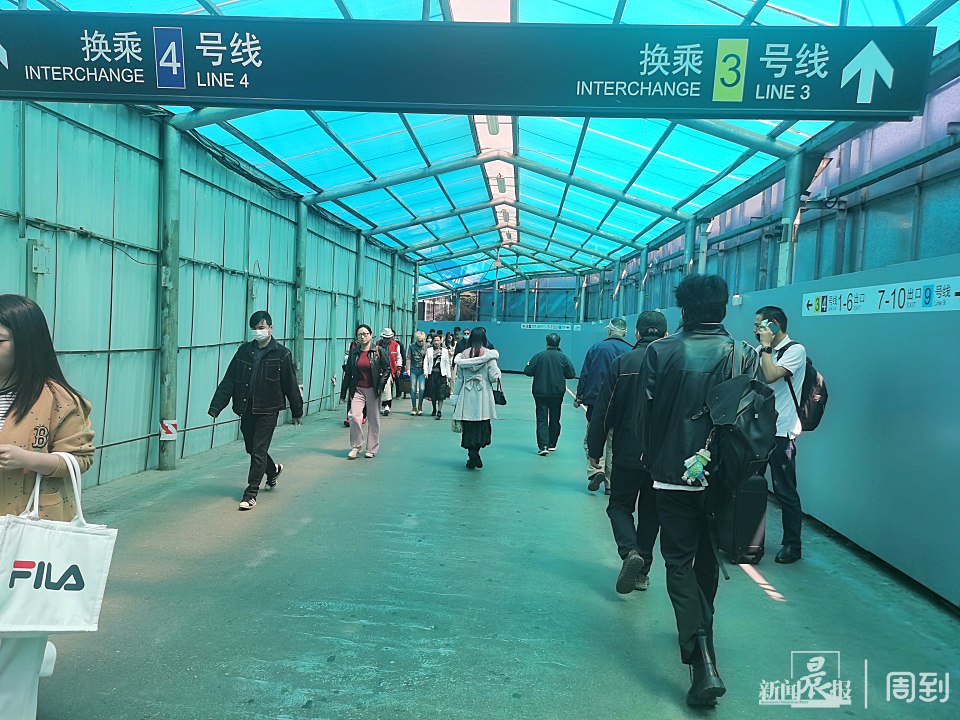 “这条路怎么关了,我要换乘9号线,不能从这里走吗?”“旧通道已经关闭了,您可以从扶梯那边下去走新通道换乘。”不少游客也会习惯性走向旧通道,看到关闭的闸门前来询问服务台的工作人员。据工作人员表示,旧通道已经关闭了,不会再开放,大棚和里面的商铺也正在进行拆除。