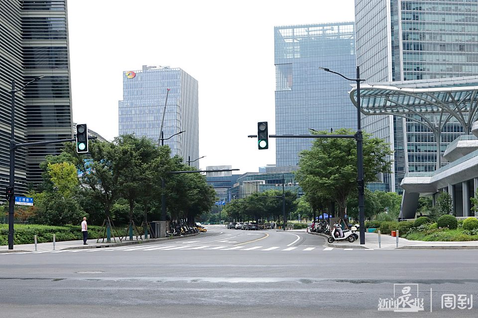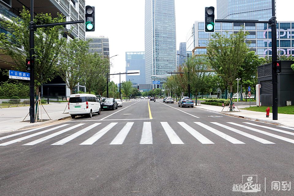 走过红绿灯,后半段路程往左前方延伸,旁边西岸人工智能中心的执勤人员宁先生正在指引车辆进出地库,他告诉记者,此前因为道路不通,给这里上班的很多车主都带来过一些困扰。“车辆到龙耀路隧道都需要绕一大圈到龙兰路那边去,还有些人不听劝告,出地库就往南行驶,走到头发现道路封闭还要拐回来,现在就方便多了,可以直接通到龙耀路隧道。”